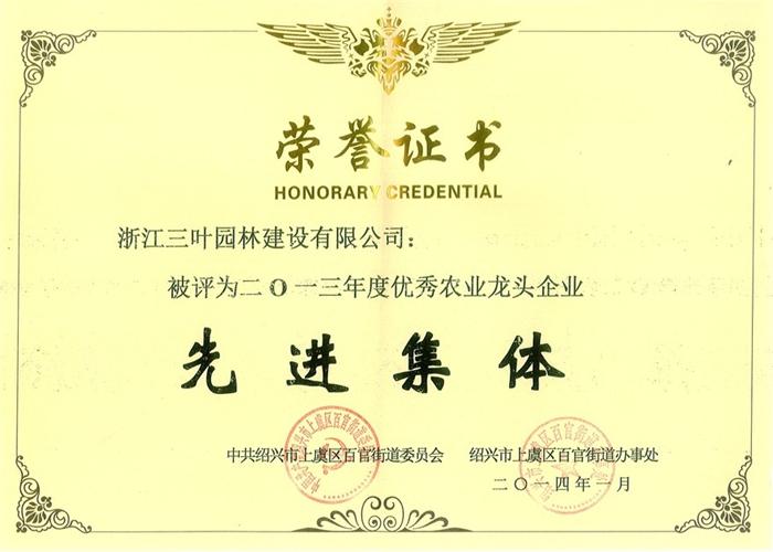 近日,在中國共產(chǎn)黨百官街道第三屆代表大會第四次會議2013年度總結(jié)表彰大會中,我司被中共紹興市上虞區(qū)百官街道委員會和紹興市上虞區(qū)百官街道辦事處榮獲”2013年度優(yōu)秀農(nóng)業(yè)龍頭企業(yè)先進(jìn)集體“榮譽(yù)。這是該公司連續(xù)三年被評為此項榮譽(yù)。多年來,公司秉承“誠信、敬業(yè)、創(chuàng)新”的理念,始終堅持以質(zhì)量求生存,在技術(shù)管理創(chuàng)新上下功夫,致力于傾情打造東方園林文化經(jīng)典,營造了大批優(yōu)秀的園林精品項目,贏得了長三角及周邊地區(qū)廣大業(yè)主的信任和美譽(yù) 。同時也得到了地方政府各級領(lǐng)導(dǎo)和廣大人民群眾的一致稱贊。