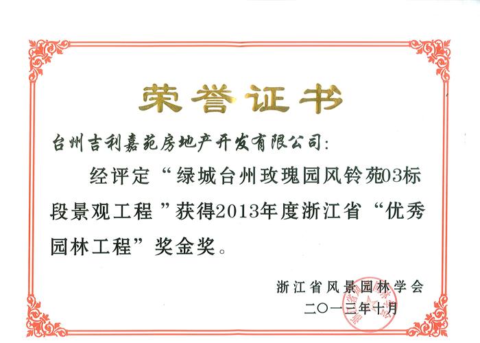 近日,根據(jù)浙江風景園林學會專家評審委員會的評定、公示、浙江三葉園林建設有限公司臺州綠城玫瑰園風鈴苑03標段景觀工程,喜獲2013年度浙江省綠優(yōu)秀園林工程金獎。
