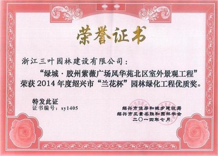 近日,根據(jù)紹興市住房和城鄉(xiāng)建設(shè)局、紹興市風(fēng)景名勝和園林學(xué)會(huì)專(zhuān)家評(píng)審委員會(huì)的資料審核、現(xiàn)場(chǎng)考評(píng)、終審評(píng)定、浙江三葉園林建設(shè)有限公司綠城膠州紫薇廣場(chǎng)風(fēng)華苑室外景觀工程,喜獲2014年度紹興市“蘭花杯園林綠化工程優(yōu)質(zhì)獎(jiǎng)。